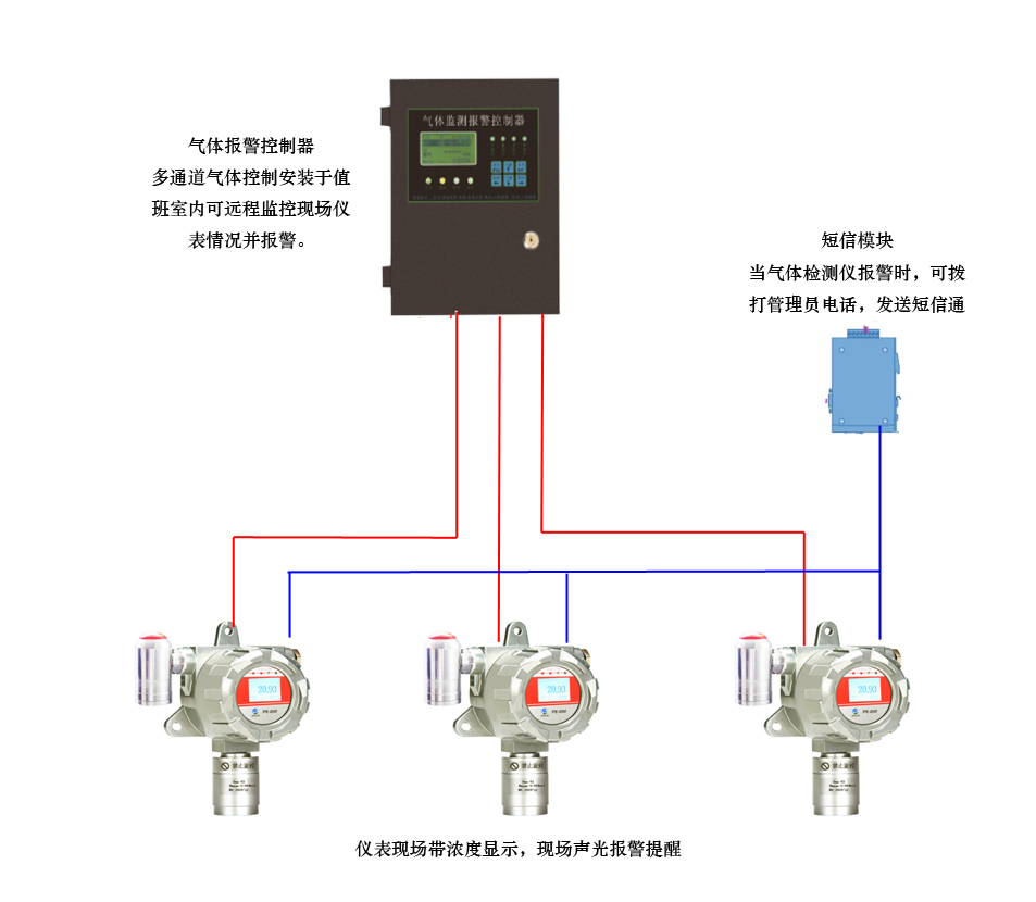 氣體控制主機(jī):這部分有比較簡單的氣體報(bào)警主機(jī),一般采用安裝在監(jiān)控點(diǎn)附近周圍的集中點(diǎn),或則是門衛(wèi)室,采用較為簡單的有線鏈接,主要傳輸方式有,4-20mA模式的三線制,或則RS485接口通訊。氣體報(bào)警主機(jī)主要是起到集中管理,集中監(jiān)控,一但有報(bào)警就有聲光報(bào)警音輸出。搭配報(bào)警繼電器,可設(shè)計(jì)驅(qū)動(dòng)排風(fēng)扇,電磁閥等配置。